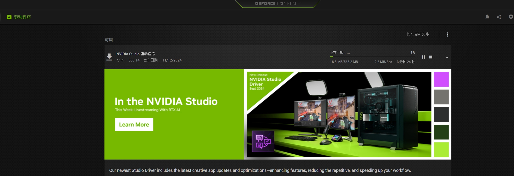 在网上查资料发现是驱动错误导致的,之前我是GameReady驱动,现在换成Studio系列。在这个驱动管理软件下能直接更换。