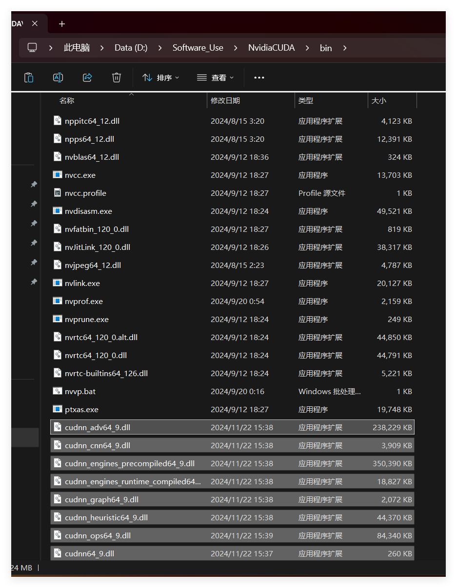 拷贝时看到,CUDA 的安装目录中,有和 cuDNN 解压缩后的同名文件夹,这里注意,不需要担心,直接复制即可。cuDNN 解压缩后的同名文件夹中的配置文件会添加到 CUDA安装目录中的同名文件夹中。【此处还是建议还是分别把文件夹的内容复制到对应文件夹中去】