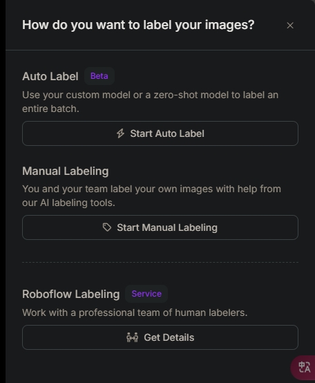 上传图片到RoboFlow平台,选择人工标注。这里可以选自动标注与平台帮你。这里我们选自己标注。